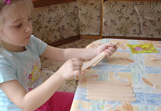 Aqui ya podemos apreciar como la niña va colocando cada palito de chupete en fila sobre la mesa de forma consecutiva .